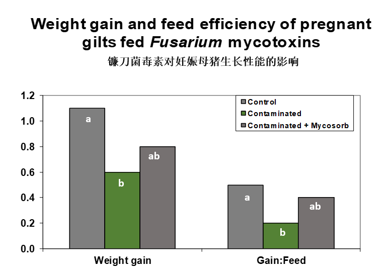 Diaz and Smith等(2006)使用EGM(商品名霉可吸或Mycosorb,奧特奇)研究表明,在含有嘔吐毒素污染(5500 ppb DON+500 ppb 15-Ac-DON+300 ppb ZEA)的妊娠母豬日糧中,添加2 kg霉可吸,可以降低母豬分娩時體重損失,提高飼料轉化效率,降低死胎比例(圖3-4) 。此外,霉可吸在提高動物免疫性能、降低炎癥反應、緩解氧化應激等方面也有顯著作用 (Van Le Thanh et al., 2015; Weaver et al., 2014) 。
